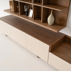Farklı boyutlardaki açık rafları, dekoratif objeler ve kitaplar için mükemmel bir sergileme alanı sunarken, kapaklı dolaplar da düzenli bir görünüm için ekstra depolama alanı sağlar. Doğal ahşap dokusu ile sıcaklık katan tasarımı, minimal renk geçişleriyle estetik bir denge kurar.