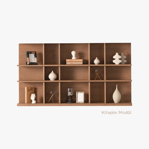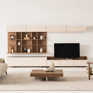 Alt çekmeceli blok, alt kapaklı blok, üst kapaklı modül ve panel kitaplık modüllerinden oluşur. Küçük evler için yalnızca bir alt ve üst modül ile kompakt bir düzen sağlanabilirken, geniş salonlarda arka paneller yan yana getirilerek uzun ve simetrik bir TV ünitesi elde edilebilir.