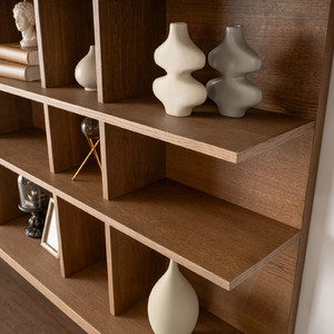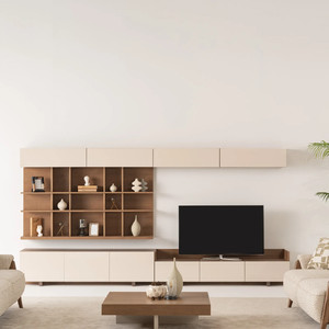 Farklı boyutlardaki açık rafları, dekoratif objeler ve kitaplar için mükemmel bir sergileme alanı sunarken, kapaklı dolaplar da düzenli bir görünüm için ekstra depolama alanı sağlar. Doğal ahşap dokusu ile sıcaklık katan tasarımı, minimal renk geçişleriyle estetik bir denge kurar.